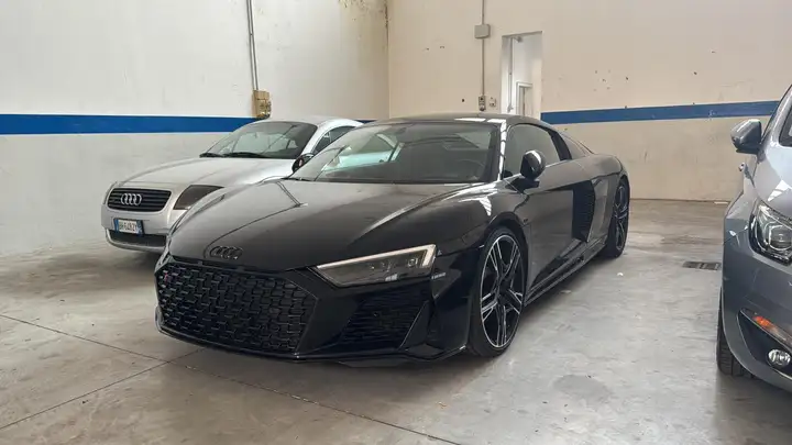 Vendo quest’Audi R8 Coupé, la vettura si presenta all’esterno in questa colorazione “Myth black Metallic”, codice 0E, spostandoci agli interni della vettura, invece, si trova una pelle nappa con alcuni inserti in Alcantara. Per quanto riguarda i sedili, in particolare, si tratta dei “Black R8 sport seats” con cuciture “Rock Gray” a contrasto. Per quanto riguarda i cerchi da 20”, si presentano in questa colorazione “Anthracite Black”.
