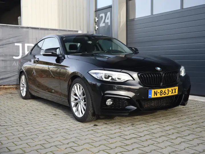 Een uitmuntend verzorgde BMW 230i uit 2020, uitgevoerd in het exclusieve Sapphire Black Metallic en voorzien van het M-pakket exterieur, wat deze coupé een krachtige en sportieve uitstraling geeft.